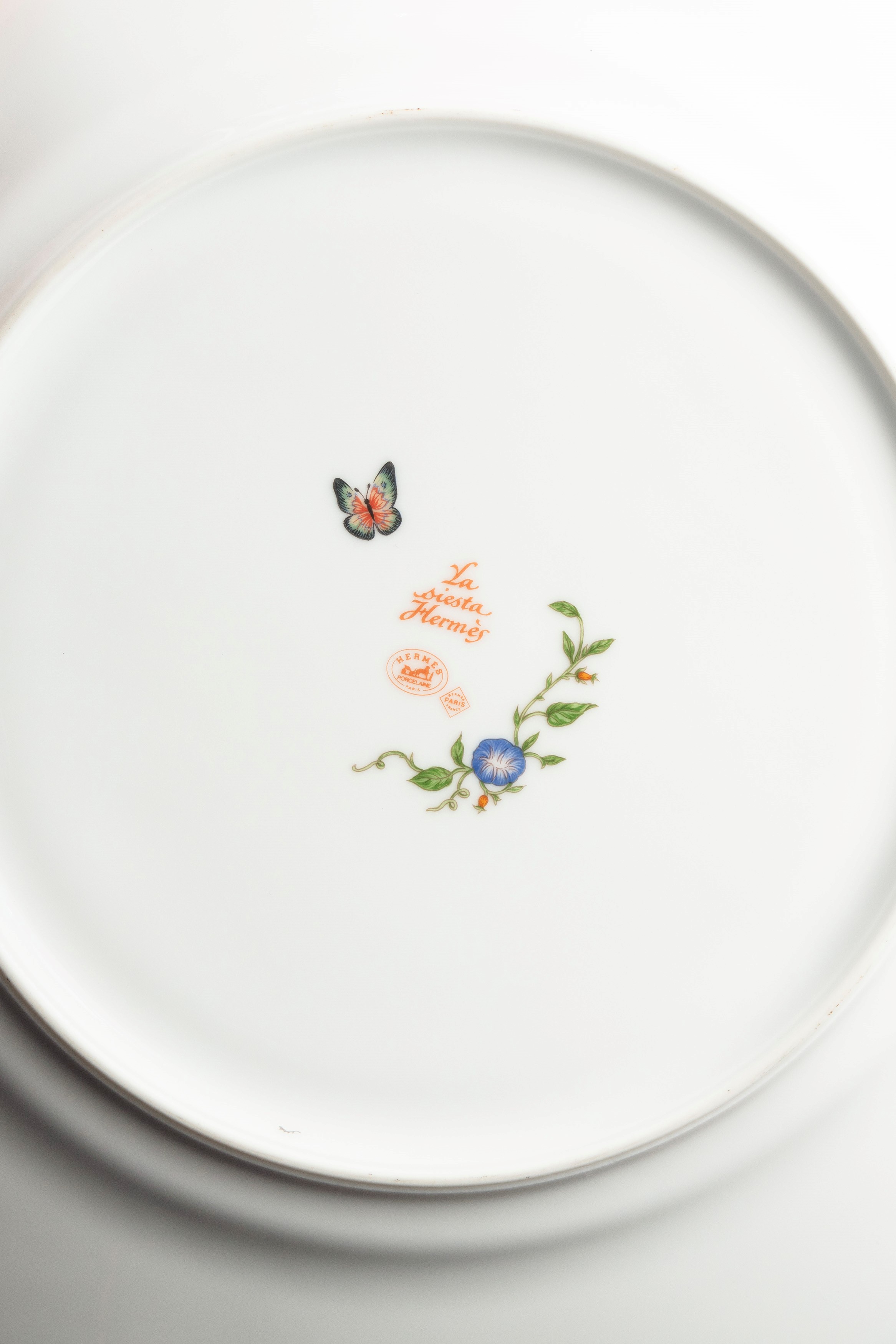White porcelain with yellow border two plates, decor “La Siesta”; cm 32 and cm 30, one with box and one with dustbagStarting bid