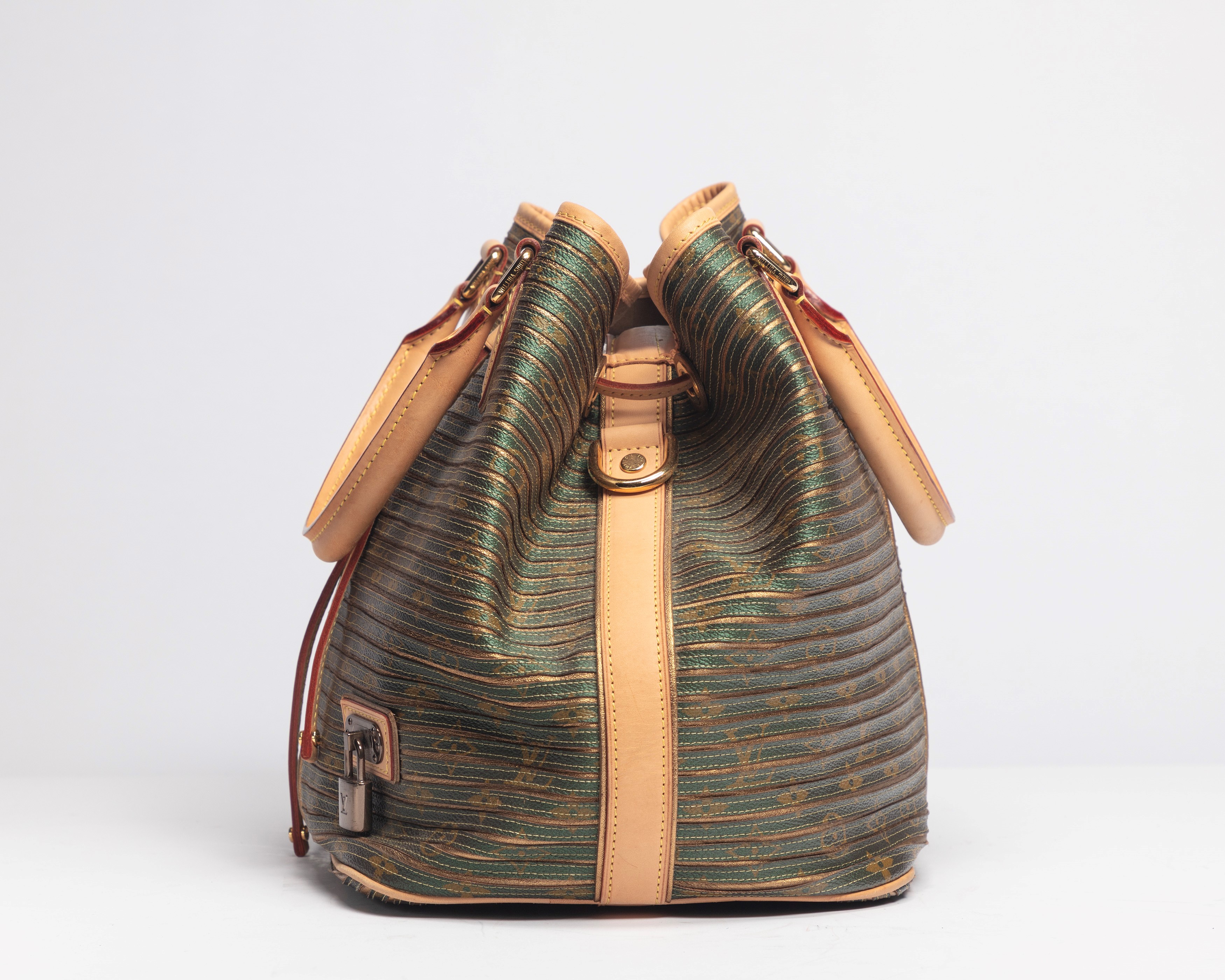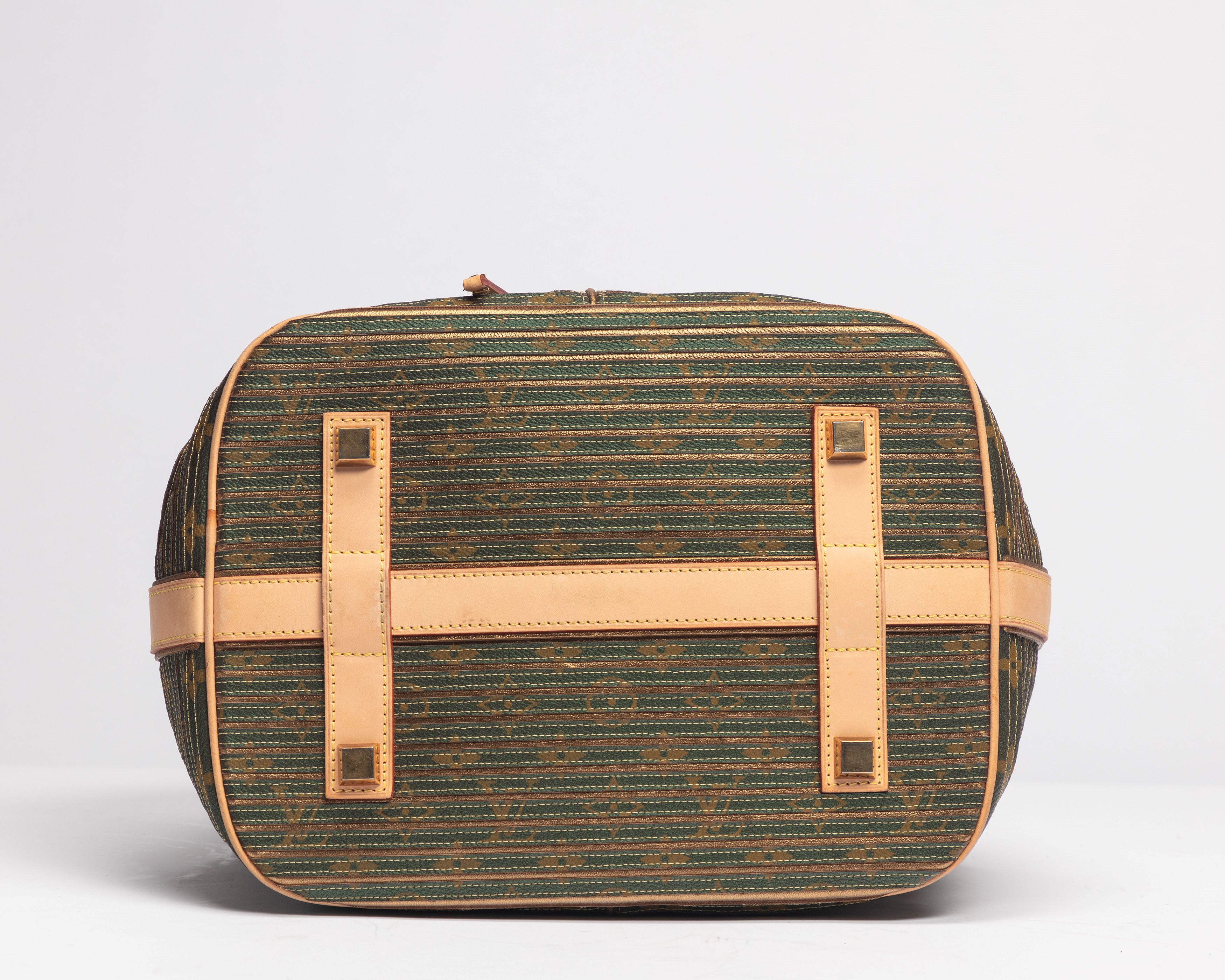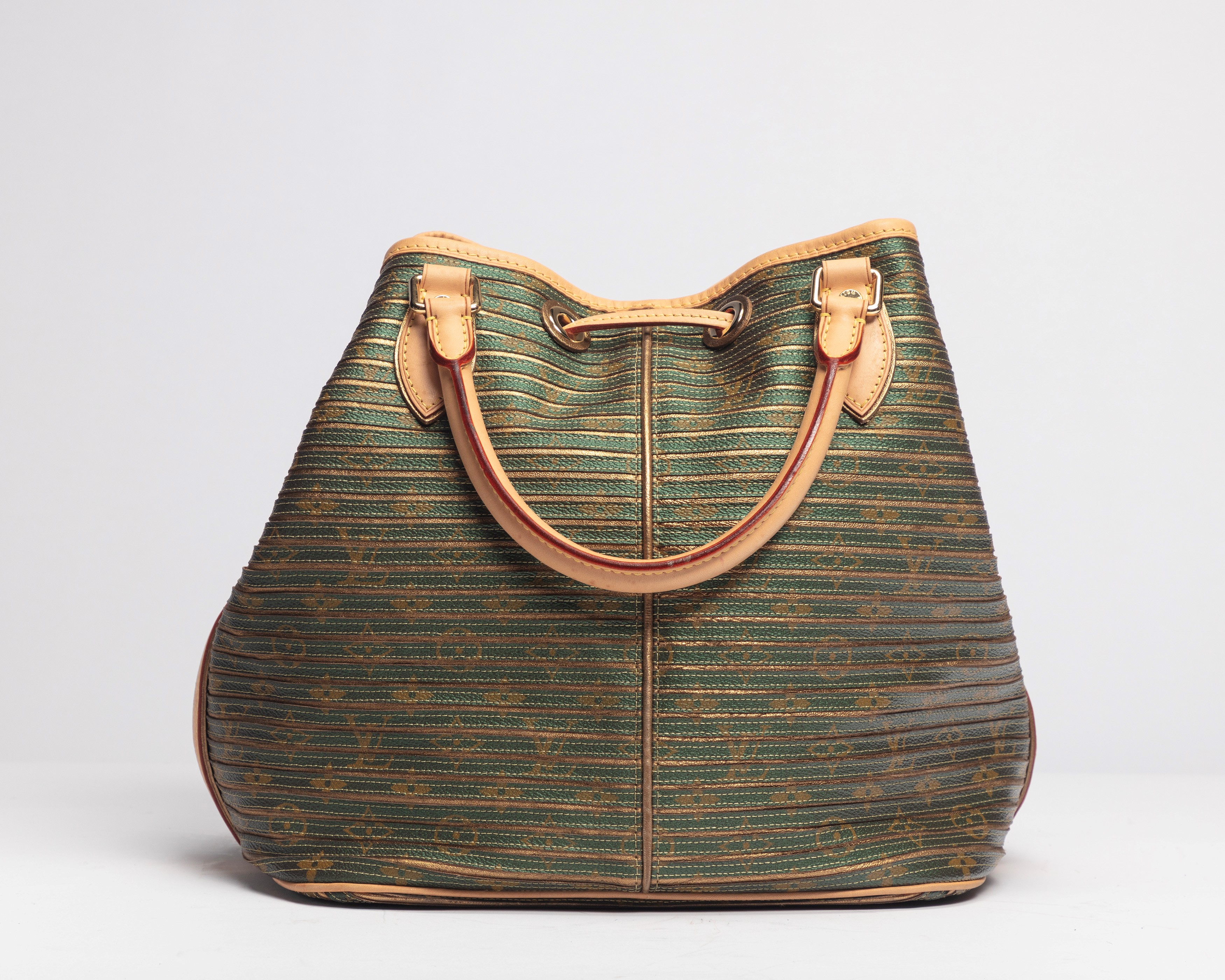 Eden fabric and leather bucket bag, green and gold stripes, leather handles and profiles, metal gilt details, cm 30 (slight defects)Starting bid