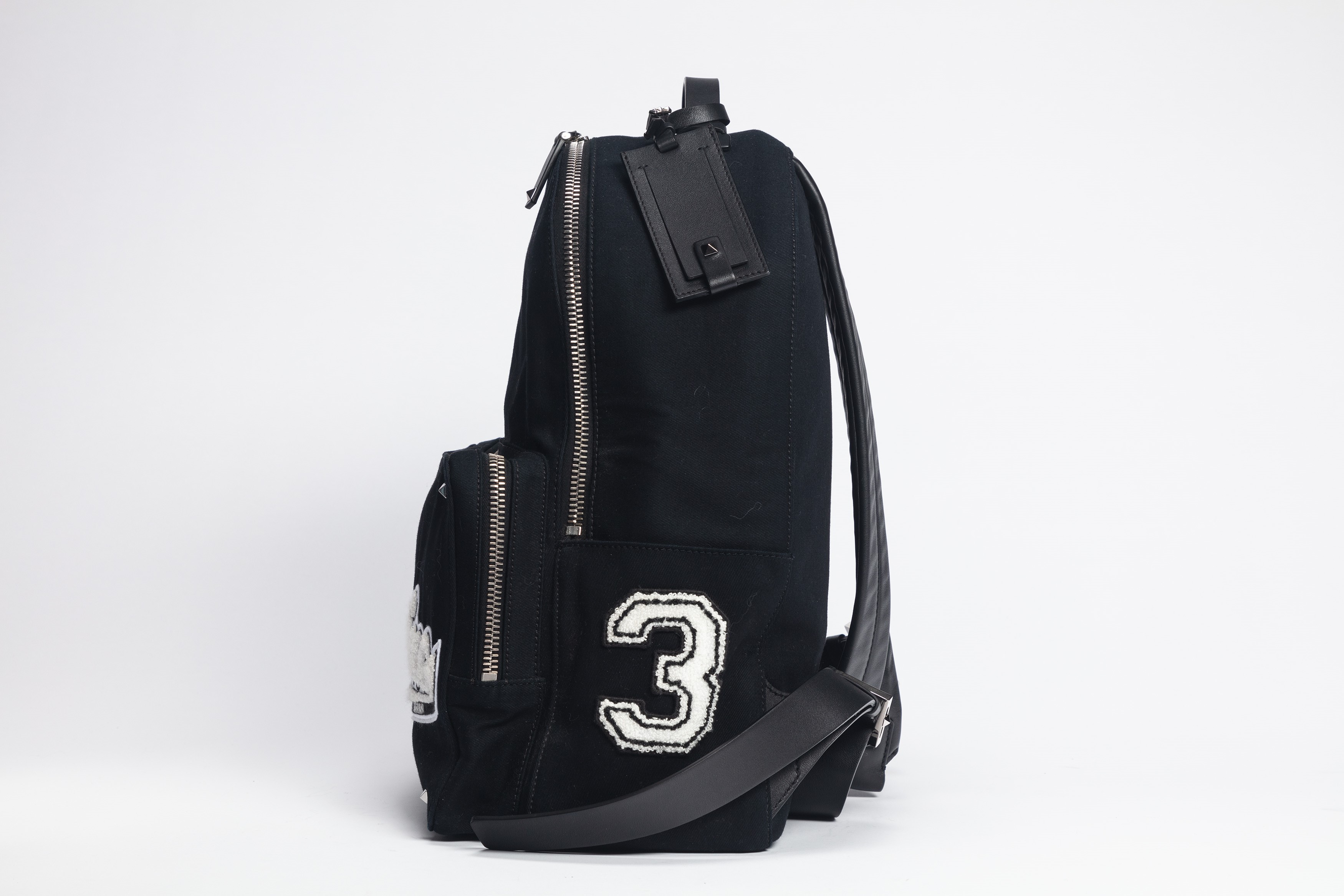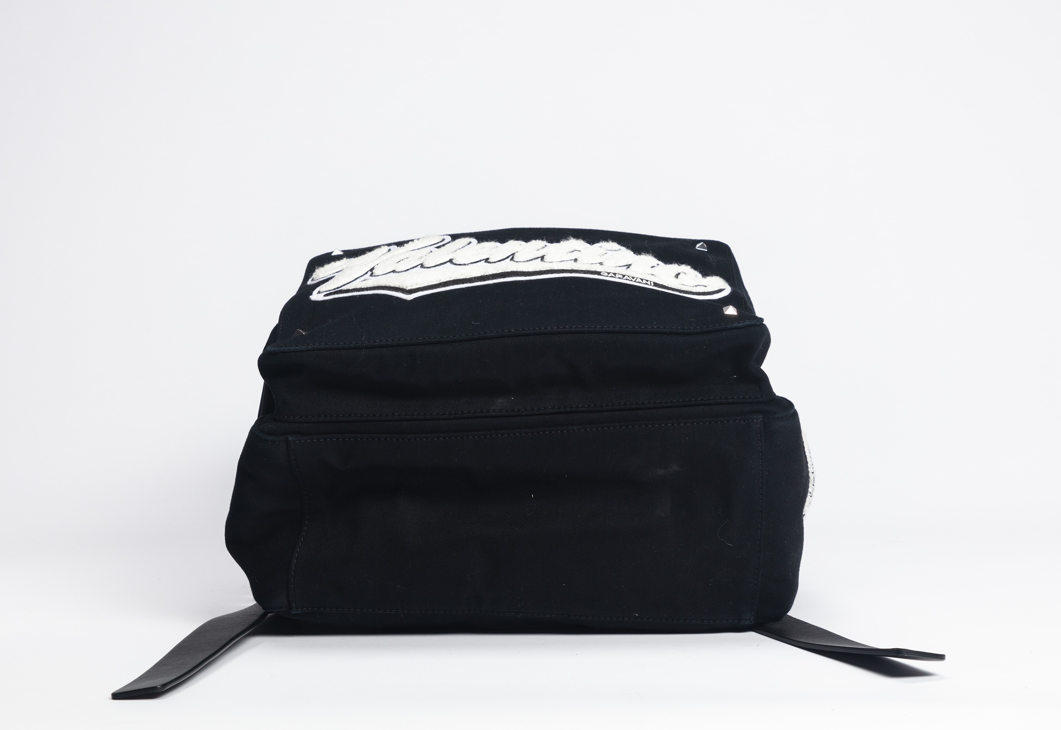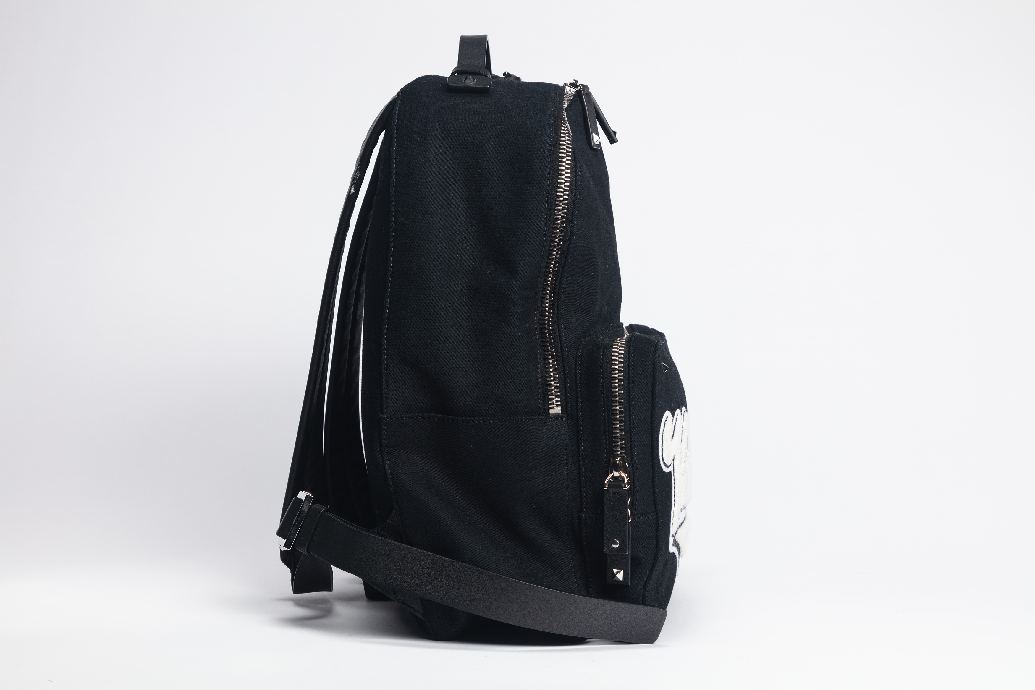 Black canvas and leather shoulder strap backpack, white applications and lettering, metal details, cm 30 (defects)Starting bid