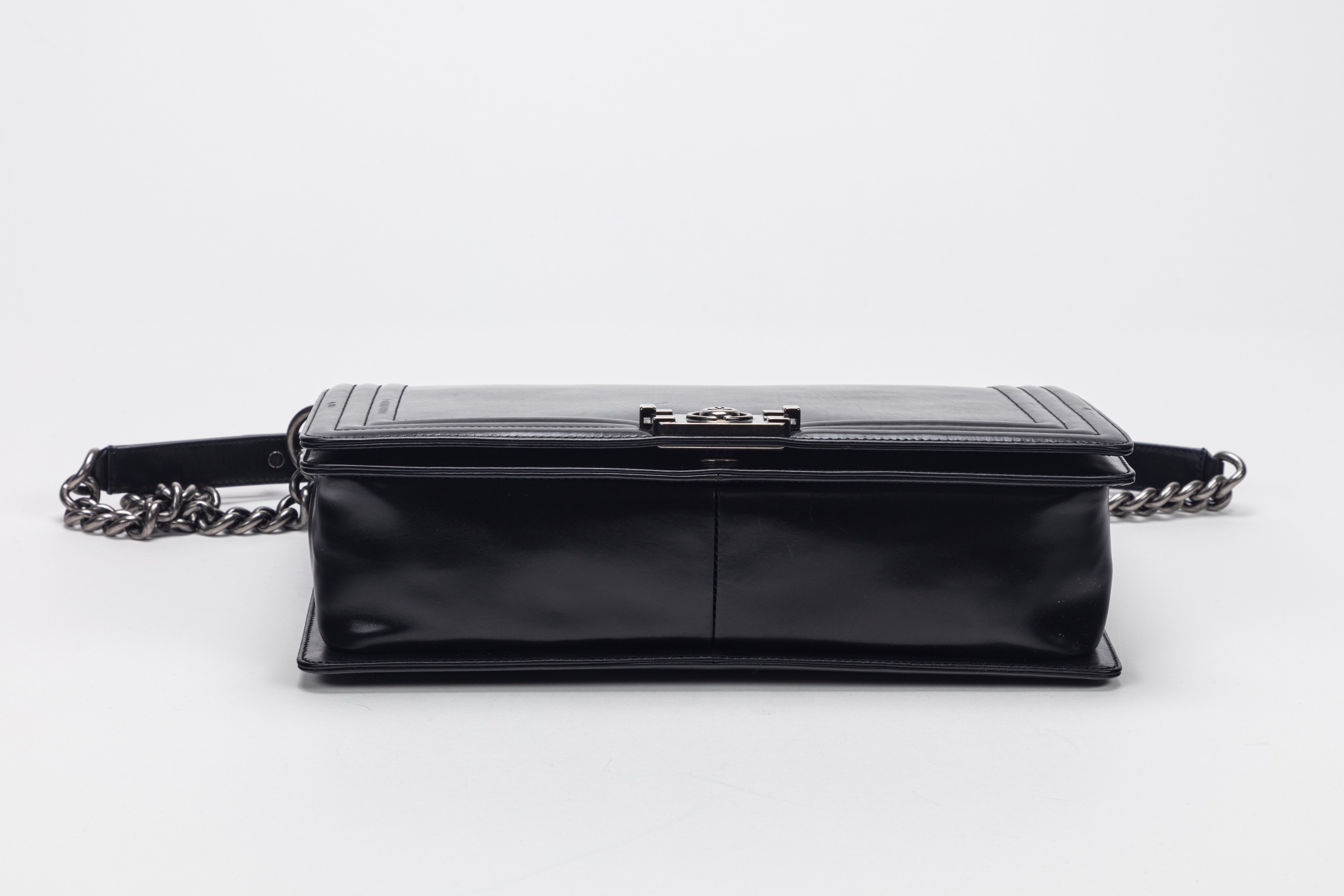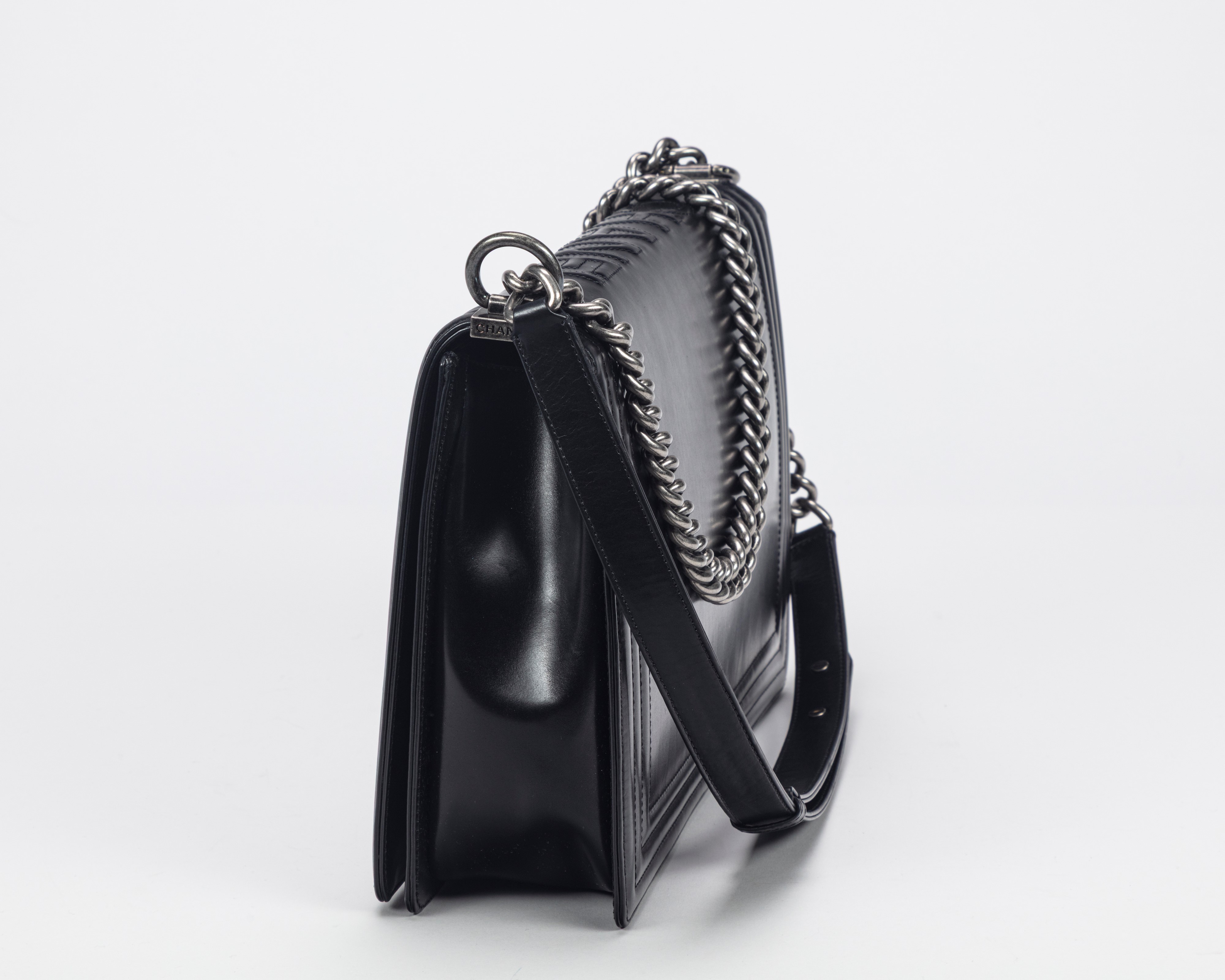 Black leather Boy bag, adjustable metal chain strap, burnished metal details, cm 30 (very slight signs of use)Starting bid
