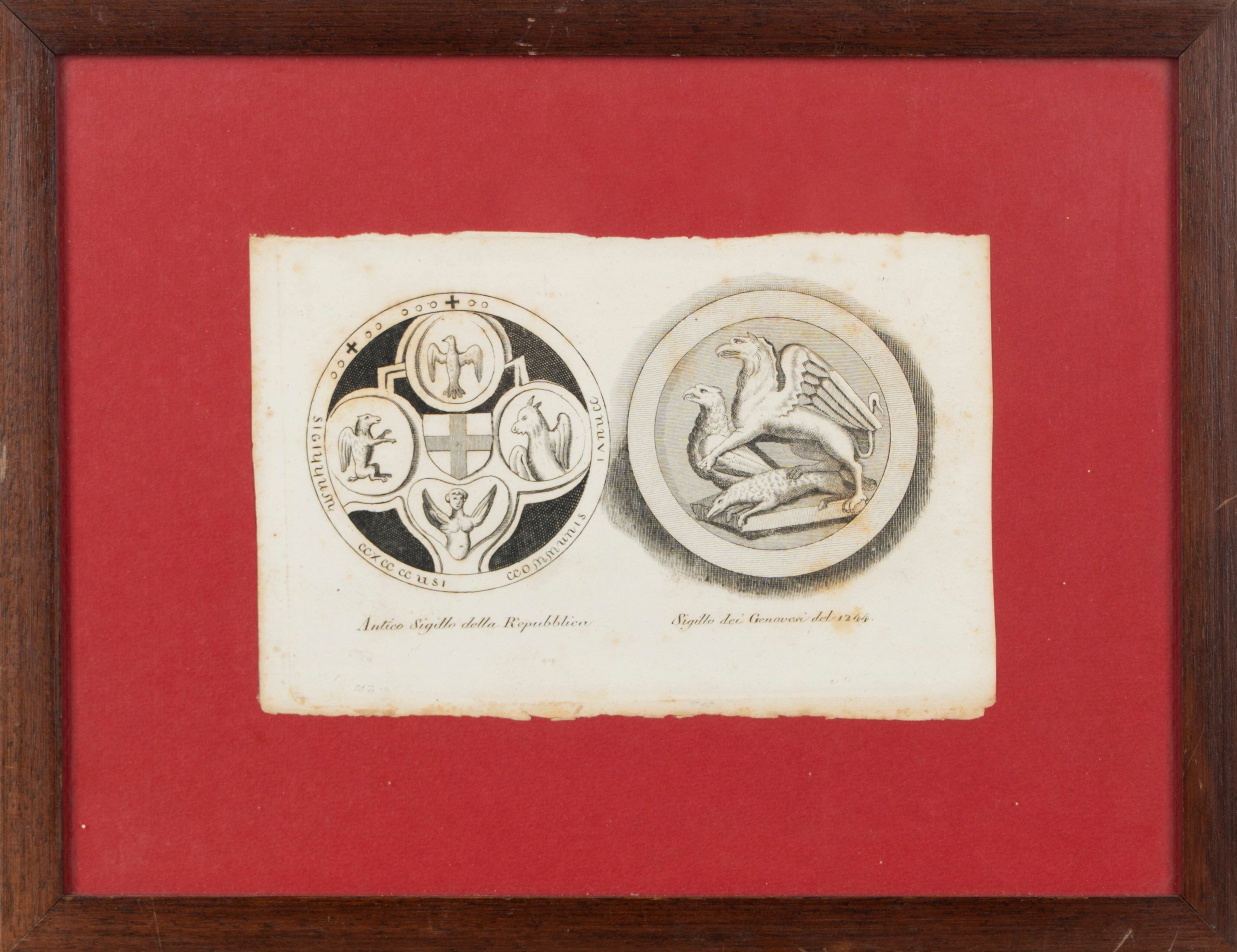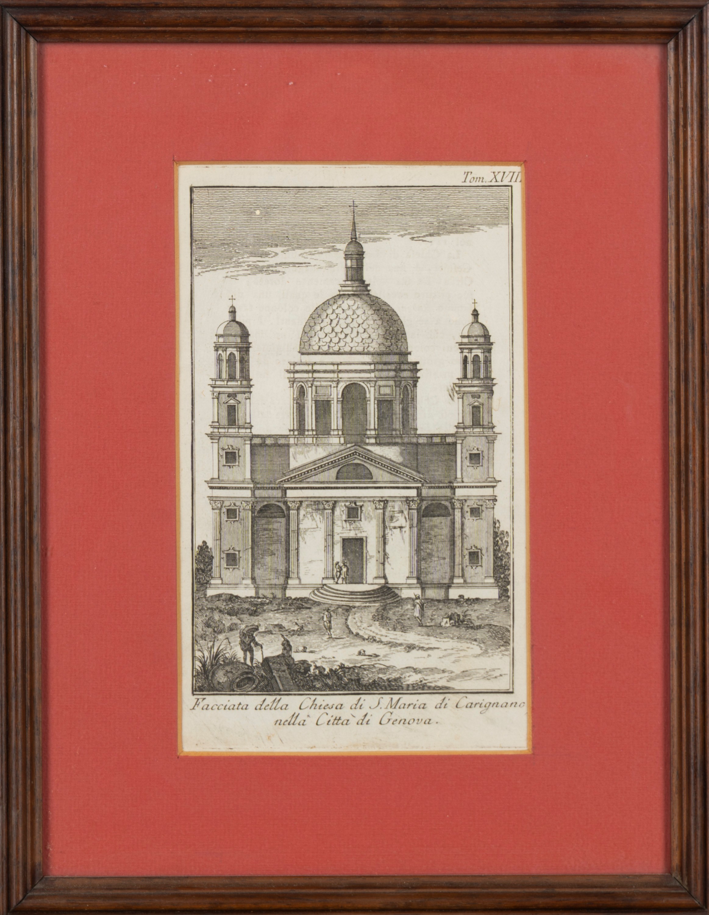 Print depicting the facade of the church of Carignano, two others depicting coats of arms and seals of the Republic of Genoa and a plan of Palazzo Doria.