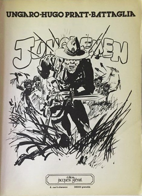 Original illustration made by Pratt as the opening image of some episodes of "Junglemen", published in Sgt. Kirk magazine n. 7 on page 32 and Sgt. Kirk magazine n. 12 on page 111 in 1968. Work later published on the frontispiece of the volume "Junglemen" edited by Jacques Glénat in 1979.