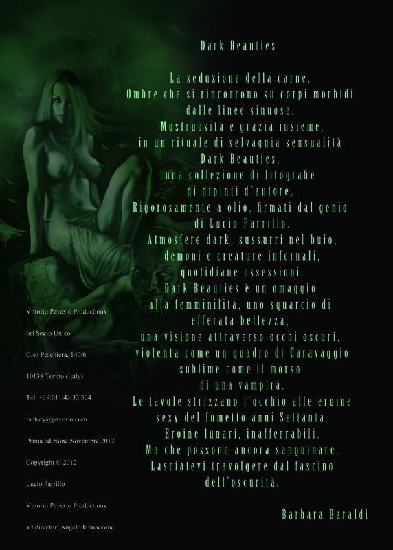 Original painting made by Parrillo as a tribute to Cimiteria, the fascinating zombie protagonist of the eponymous series, one of the most famous Italian erotic paperback comics. The work was published in the "Dark Beauties" portfolio by Pavesio Editore in 2012. << The seduction of the flesh, shadows chasing each other on soft bodies with sinuous lines. Monstrosity and grace together, in a ritual of wild sensuality. Dark Beauties is a tribute to femininity, a glimpse of brutal beauty, a vision through dark eyes, as violent as a Caravaggio painting, as sublime as a vampire bite. >> Posting holes in the margins. The preliminary pencil drawing is attached. Signed and dated on the front and back.