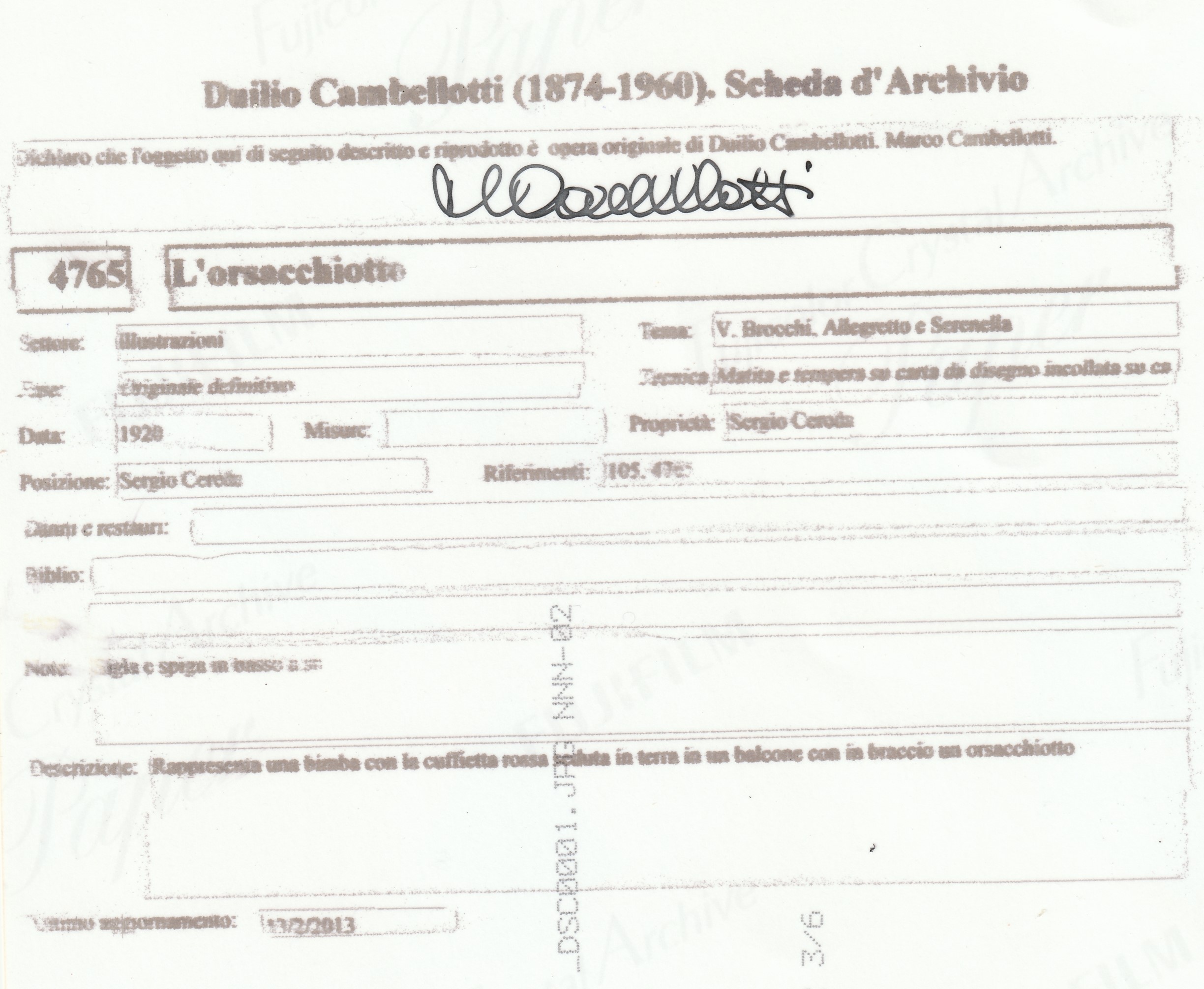Original illustration made by Cambellotti for "Piccoli amici: la storia di Allegretto e Serenella" by Virgilio Brocchie, published by Mondadori in 1921. Cambellotti initially approached Art Nouveau, however accepting the purely original and pioneering aspects expressed by the ideas of William Morris , and then approached futurism. He, like Morris, saw a social, global, moralistic, pedagogical purpose in art in order to make it accessible to all and, like the English artist, he became the clear example of the artist-craftsman par excellence. Considered one of the most shining examples of Art Nouveau in Italy, Cambellotti was a painter, sculptor, ceramist, set designer, designer, architect and engraver, but it is perhaps in illustration that all the artistic instances he approached during his career converged . Artwork archived in the Cambellotti Archive with no. 4765 in 2013, a copy signed by Marco Cambellotti is attached. Signed.