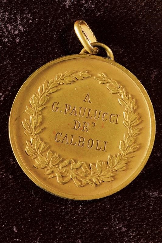 On one side "L'VNIONE CINEMATOGRAFICA EDVCATIVA / SCIENTIA LVMEN VITAE"; on the other within laurel branches "A G. PAULUCCI DE’ CALBOLI". At the top suspension ring. Gold. 16g. Kept in a leather-covered case entirely lined in satin.