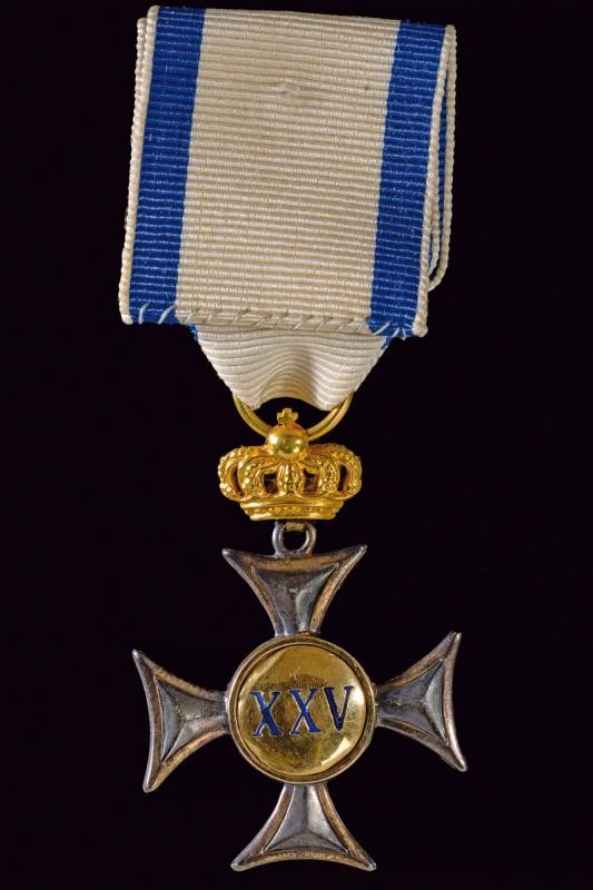 Cross for twenty-five years of service. The centre enamelled with the monogram "FV", for Franz V of Habsburg-Este (Duke of Modena). The silver quillons with gold frame, under crown and with ribbon. Rare.