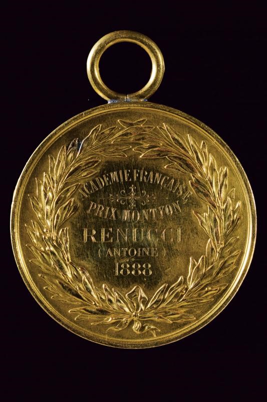 Gilt bronze medal. On the obverse a bust (right) "ANTOINE JEAN BAPTISTE / ROBERT AUGET DE MONTYON"; opus ‘GATRARD’.On the reverse within palm crown "ACADEMIE FRANCAISE PRIX MONTYON RENUCCI (ANTOINE) 1888". At the top large fixed suspension ring. Kept in a