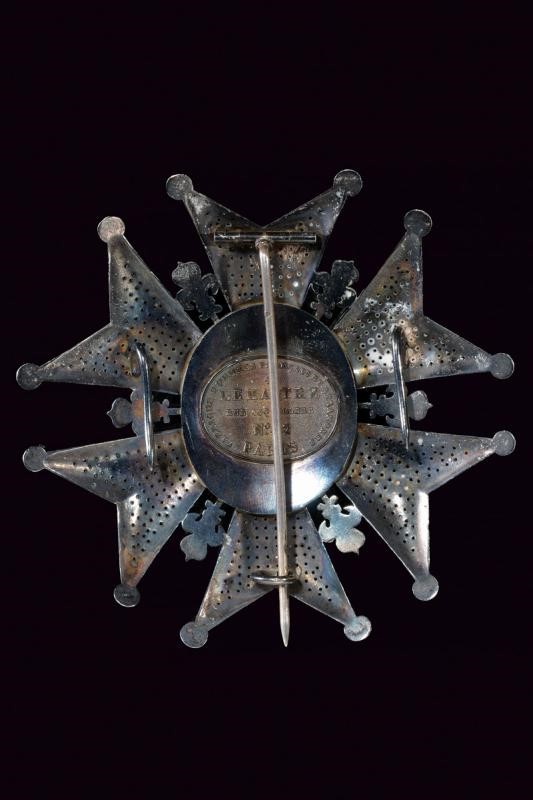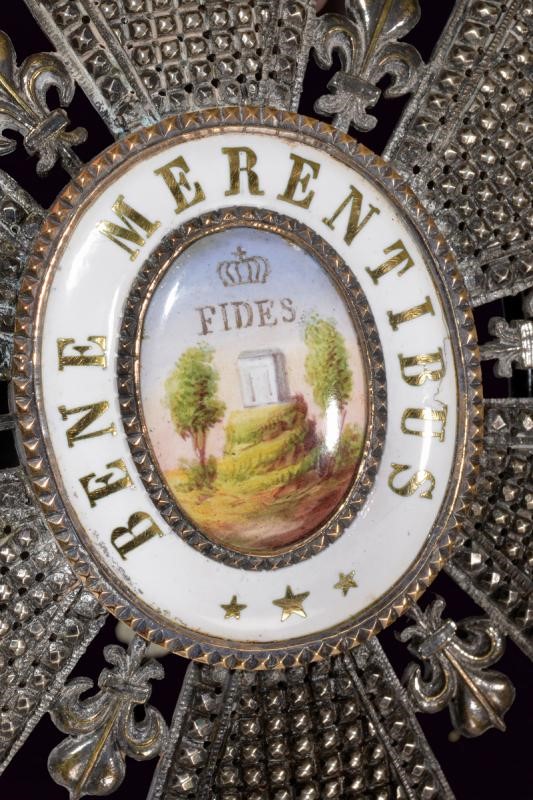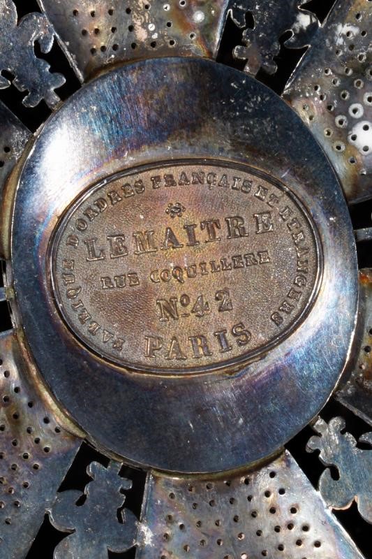 Beautiful polished and pierced silver plaque, decorated with fleurs-de-lis at the edge; enameled oval medallion, marked “FIDES” under crown at the center, bandeau “BENE MERENTIBUS.” The back with mark of the Lemaitre's Paris, vertical pun with marks and t