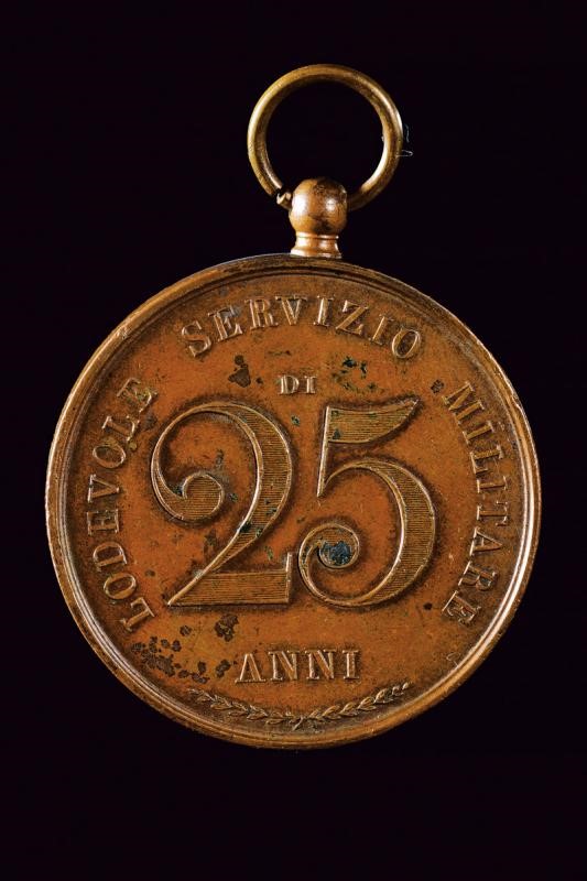 Military reward medal for twenty-five years of service, made of bronze. On obverse “FERDINANDO II,” the bust of King on column, around trophies and flags. On the reverse the inscription “LODEVOLE SERVIZIO MILITARE DI 25 ANNI.” At the top a small button wi