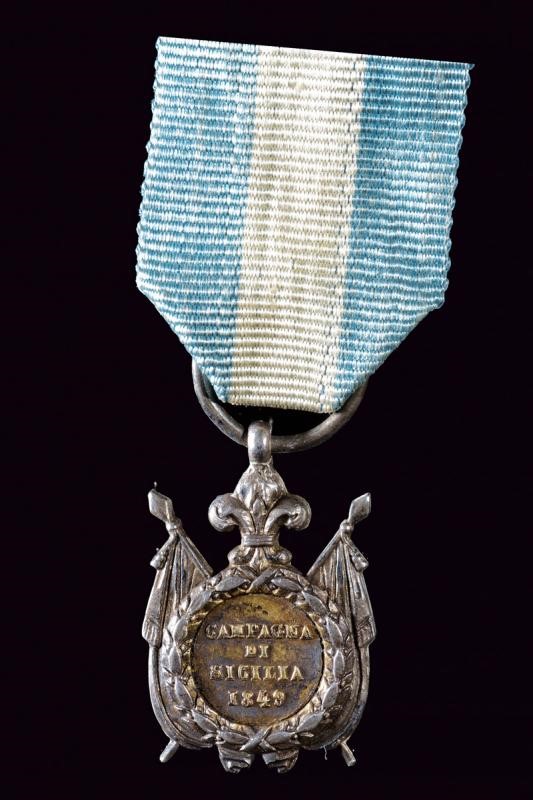 Badge for the repression of the Sicilian uprising; miniature in silver, on the obverse, head of Ferdinand II (right) under lily. On the reverse "CAMPAIGN OF SICILY 1849" in four lines. On ribbon. Rare.