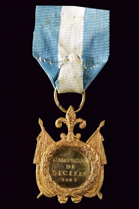 Badge for the repression of the Sicilian uprising; copper with gilded medallion, on the obverse, head of Ferdinand II (right) under lily. On the reverse "CAMPAGNA DI SICILIA 1849" in four lines. On ribbon. Rare.
