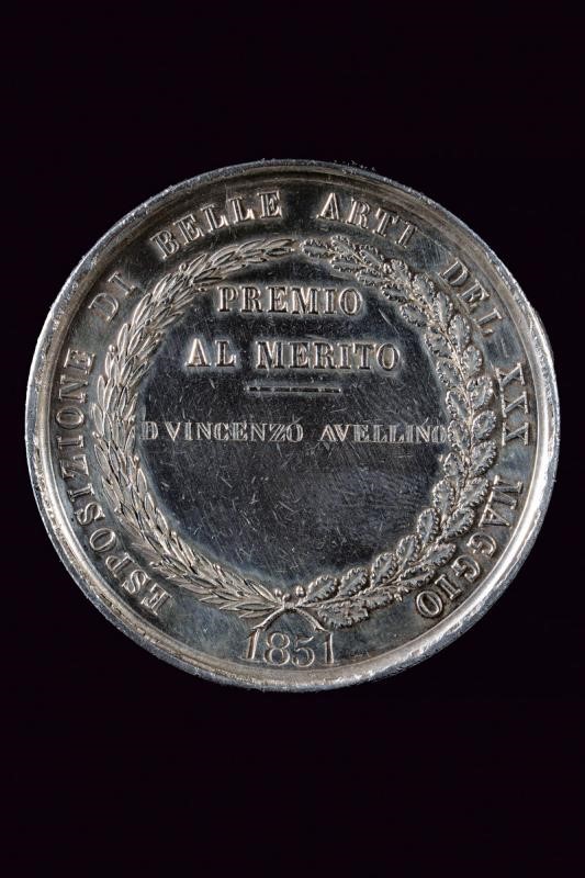 Prize medal at the 30th May Fine Arts Exhibition, made of silver. On the obverse a bust (right) with inscription "FERDINANDO II RE DEL REGNO DELLE DUE SICILIE E DI GERUSALEMME". Opus Cariello and Ciccarelli. On the reverse "ESPOSIZIONE DI BELLE ARTI DEL X