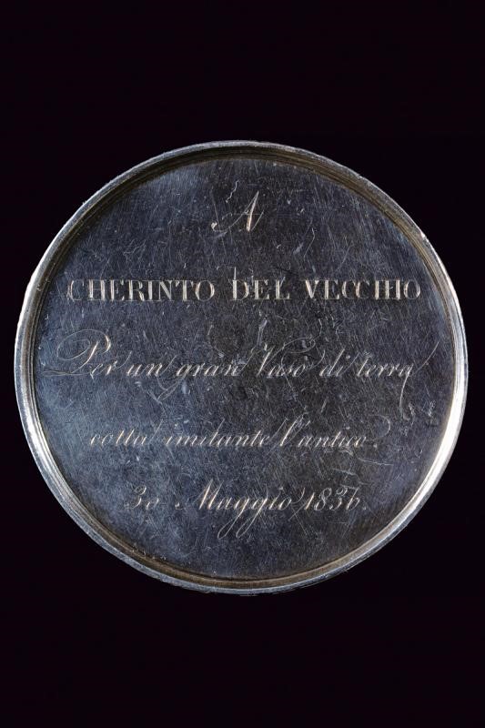 Award medal made of silver. On the obverse inscription on the border "FERDIANDVS II REGNI VTRIVSQVE SICILIAE ET HIERVS REX", in the centre a bust of the king (right); opus "A. CARRIELLO / REGA / DE ROSA". On the reverse "A CHERINTO DEL VECCHIO / Per un gr