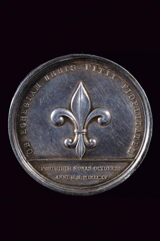 Very rare, silver medal for the arrest of Joachim Murat at Pizzo Calabro. On the obverse, "FERDINANDUS IV UTRIUSQUE SICILIAE REX P F A", a beautiful crowned head of the King (right). On the reverse, Bourbon lily and inscription on the border "OB EGREGIAM