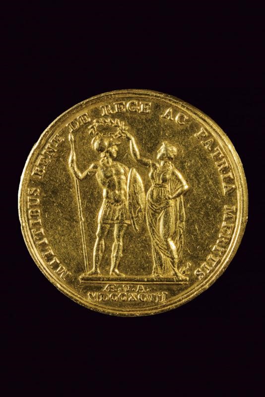 Very rare gold medal awarded for military bravery. On the obverse, bust (right), wearing plumed helmet and cloak, surrounded by the inscription "FERDINANDVS IV UTRIUSQ. SICILIAE REX P.F.A.". Opus "Morghen". On the reverse, a standing soldier, facing right