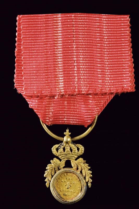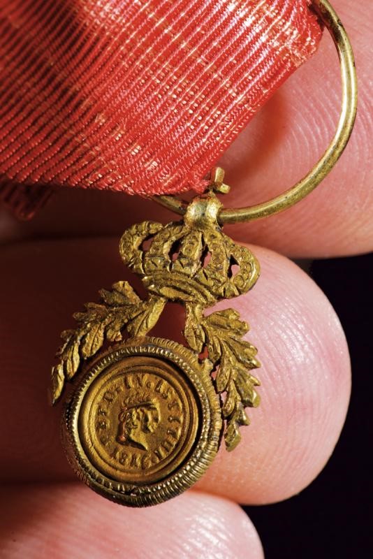 Medal of Merit for the Security Guard for the events of 22 May 1815. Gilt metal miniature. With crown and branches. On the obverse, bust of the King(right) and inscription "FERDINANDO IV ISTITUI 1816". On the reverse, bourbon lily and inscription "ALLA GU