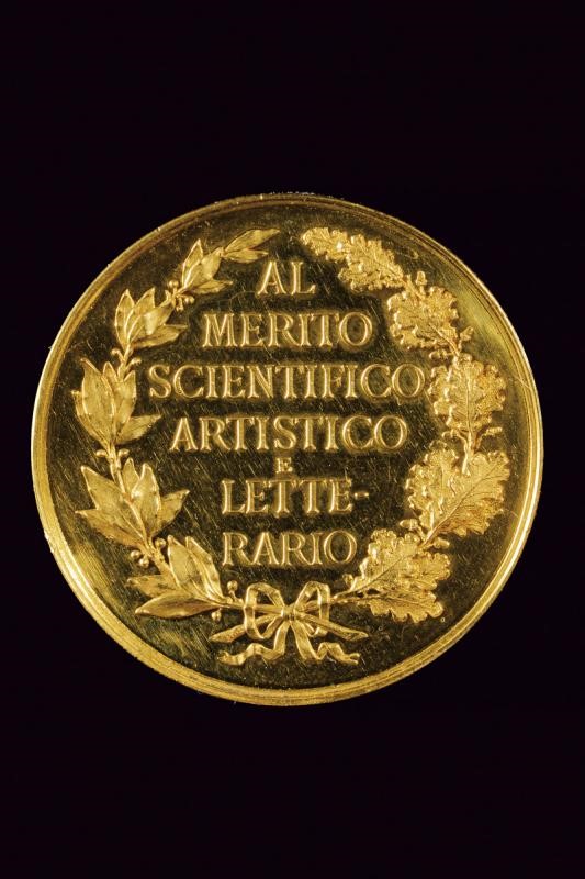 Rare gold medal of merit. On the obverse a bust of Ferdinand (left), with inscription "FERDINANDO IV GRANDUCA DI TOSCANA", Opus "VK"; below "1862". On the reverse within a crown of oak and laurel fronds the legend "AL MERITO SCIENTIFICO ARTISTICO E LETTER