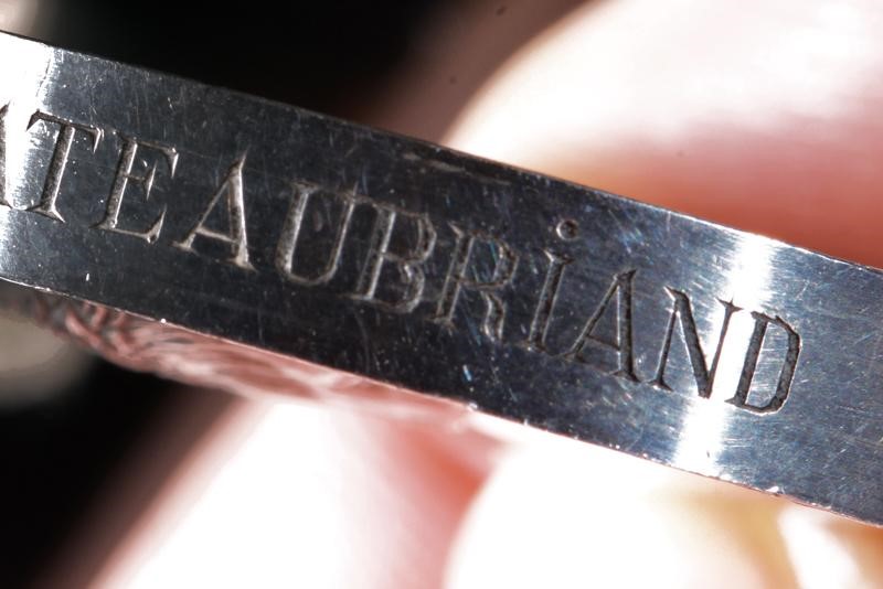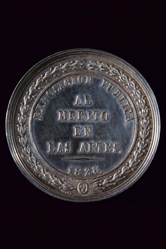 Silver medal of merit. On the obverse a bust (right), on the border "FERNANDO VII PROTECTOR DE LA INDUSTRIA"; on the neck cut "MGS". On the outer border the name "FRANCOIS RENE DE CHATEAUBRIAND". On the reverse "EXPOSICION PUBLICA / AL MERITO EN LAS ARTES