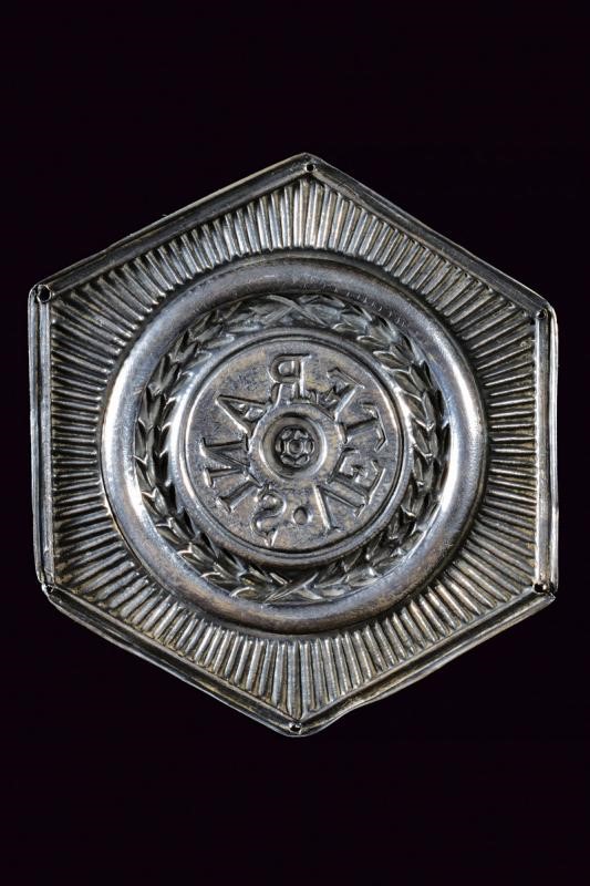First-class veterans' shield. Made of silver, hexagonal shape. In the centre inscription "VETERANIS". Rare.