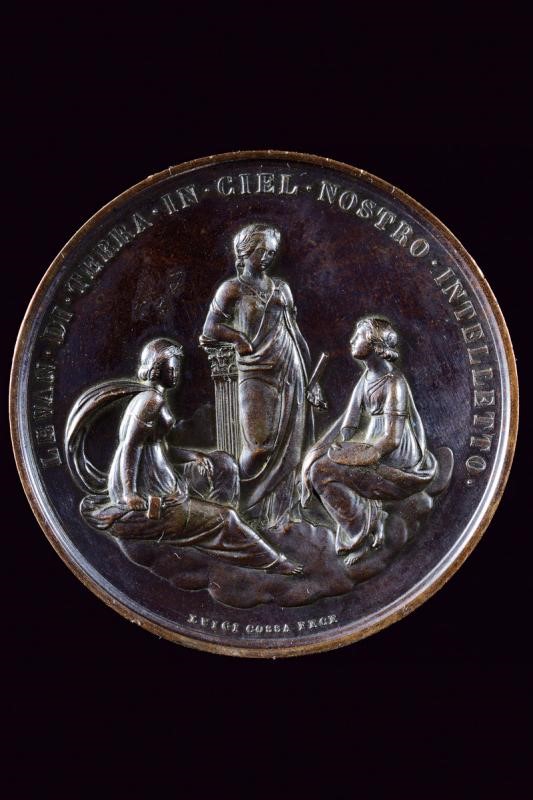 Bronze medal. On the obverse head (left) with inscription "FRANCESCO. V. D'AUSTRIA. D'ESTE. DUKE OF MOD. REG. MIR. MAS. E CAR.". Opus L. COSSA F. On the reverse three female figures among the clouds, allegory (left) of painting, architecture and sculpture