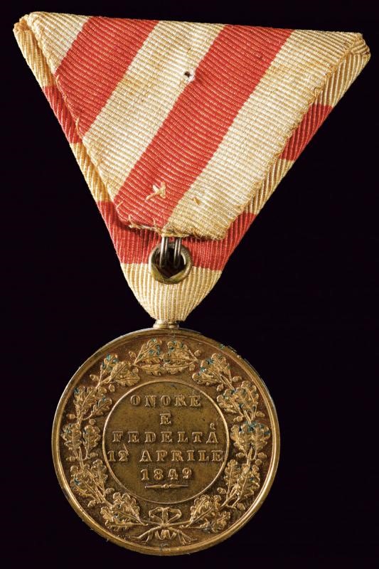 Medal for the faithful to the Grand Duke 1849. Made of gilded bronze (missing parts). On the obverse a head (left) and inscription "LEOPOLDO II GRANDUCA DI TOSCANA". On the exergue "G. NIDEROST F. 1849". On the reverse "ONORE E FEDELTA' 12 APRILE 1849" wi