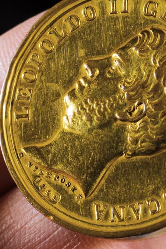 Rare medal of merit awarded to people who cooperated in the re-establishment of the kingdom after Leopold's flight to Gaeta, made of gilded bronze. On the obverse a bust (left), on the border "LEOPOLDO II GRANDUCA DI TOSCANA"; below the neck cut opus "G.