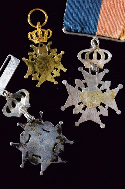Lot of three badges. One cross dated 1828 for the coronation, and two marked "MIGUEL PRIMEIRO". All with crown, one with ribbon.