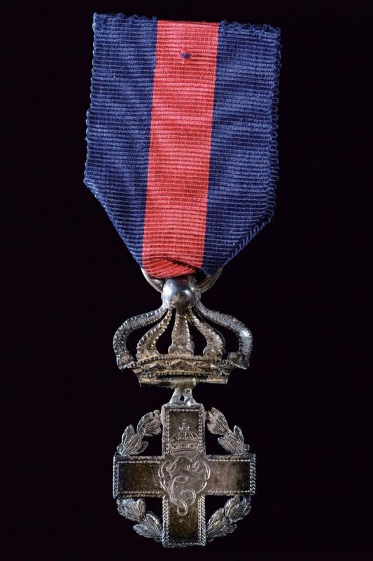 Silver cross enamelled on one side in red and white (small restoration at the top), engraved on the back with the royal monogram "VE". Under crown and original ribbon. Rare, manufactured very close to the birth of the Order.