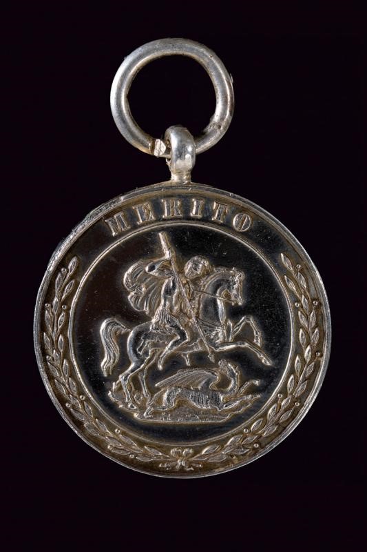 Rare silver medal, inscription ‘MERIT’ and beautiful effigy of St. George piercing the dragon on both sides. Suspension ring at the top. Very small remains of gilding.