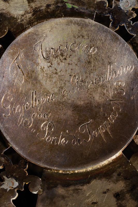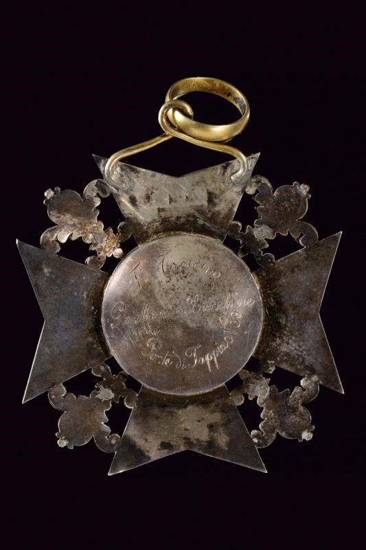 Grand cross plaque with fleur-de-lis and gilded centre, the ring with chip. The rear part was modified to be worn around the neck; the medallion in the centre marked ‘F. Criscino Gioielliere e Bisciuttiere S.da Ponte di Tappia N 30’.