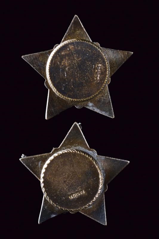 Lot of two grade stars with enamelled order in the centre. One star with small chip. Disc-shaped closure marked "BRONZO". Rare.