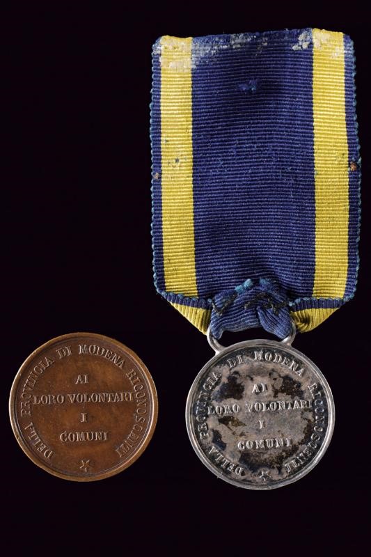 A medal of the Municipalities of the Province of Modena to the Volunteers from 1848-1860. On the obverse "AI VOLONTARI I COMUNI", around "DELLA PROVINCIA DI MODENA RICONOSCENTI", on the reverse "GUERRA DELLA INDIPENDENZA ITALIANA", around "1848 1849 1859