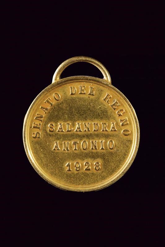 Medal of the Senate, made of gold. On the obverse head of the king (right) and inscription "VITTORIO EMANUELE III RE D'ITALIA". Opus SIRLETTI and R.Z. On the reverse "SENATO DEL REGNO - SALANDRA ANTONIO 1928". 6.6 g. Rare.