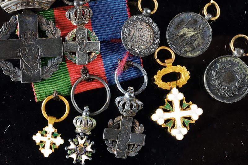 Military Order of Savoy: Miniature 1st Model together with an even smaller miniature. Order of Saints Maurice and Lazarus with gold agraffe. A silver "AL VALORE MILITARE" medal, a silver VE II medal, a silver Napoleon III medal (1859). Together with a thr