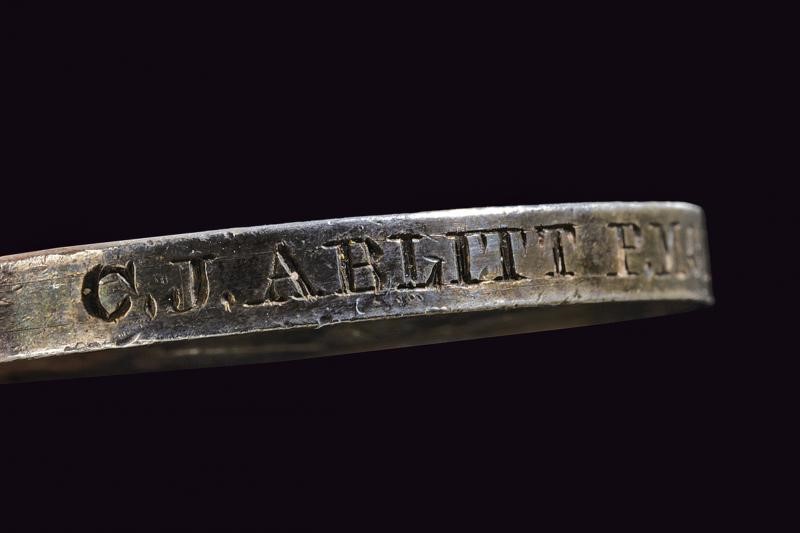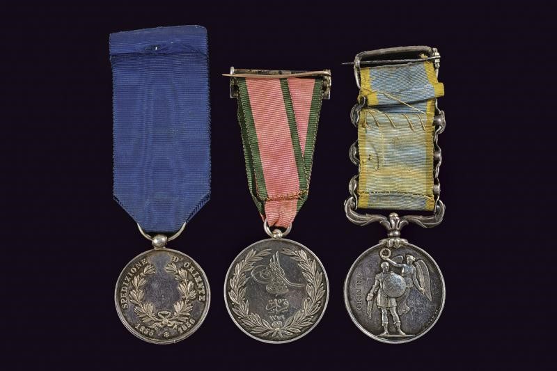 Crimean medal 1854, on the obverse bust (left) with the inscription "REGINA VICTORIA" and date 1854. On the border inscription "C. J. ABLITT P.M.C. RIFLE BRIGADE", on original ribbon with three clasps "SEBASTOPOL", "INKERMANN" and "ALMA". Together with th