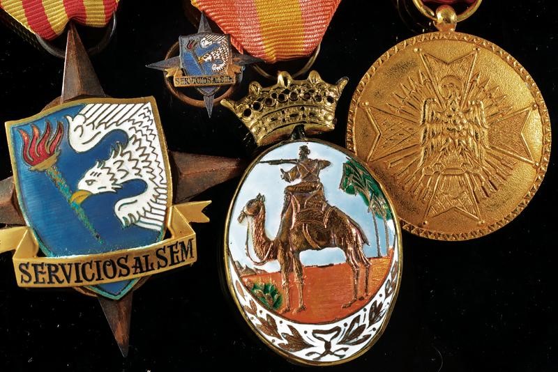 Two of enameled metal, one marked "IFNI SAHARA", the other "SERVICIOS AL SEM" (with miniature). The last round, gilded with eagle on yoke and arrows. All on ribbon. Franco era.