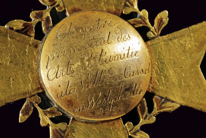 A gilded and enameled one (small damaged parts), under crown, with the inscription "F. W. num g. Zepter im O zu Custrin" and "gest.d. 7t Octbr 1783" on the back. The other one gilded and enamelled (small damaged parts) with the inscription "Chapitre prima