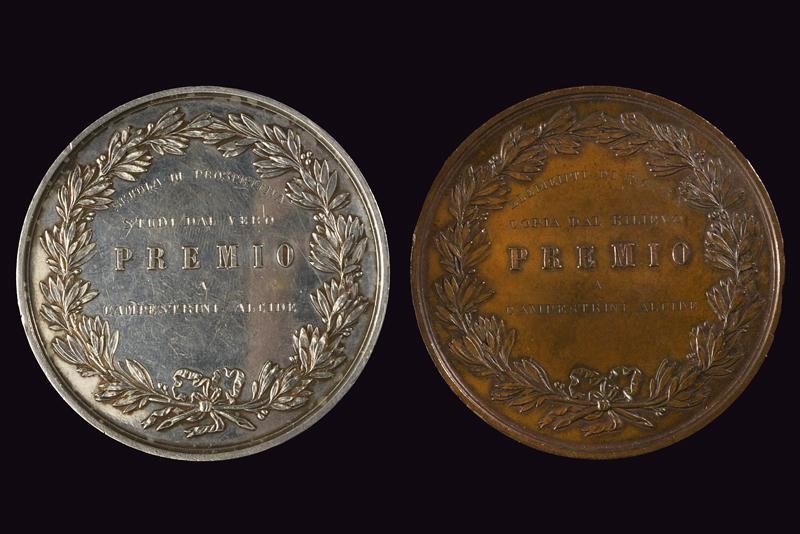 One in bronze and one in silver (237 g). Opus "L. MANFREDINI". On the reverse, within oak and laurel branches category and name "CAMPESTRINI ALCIDE".