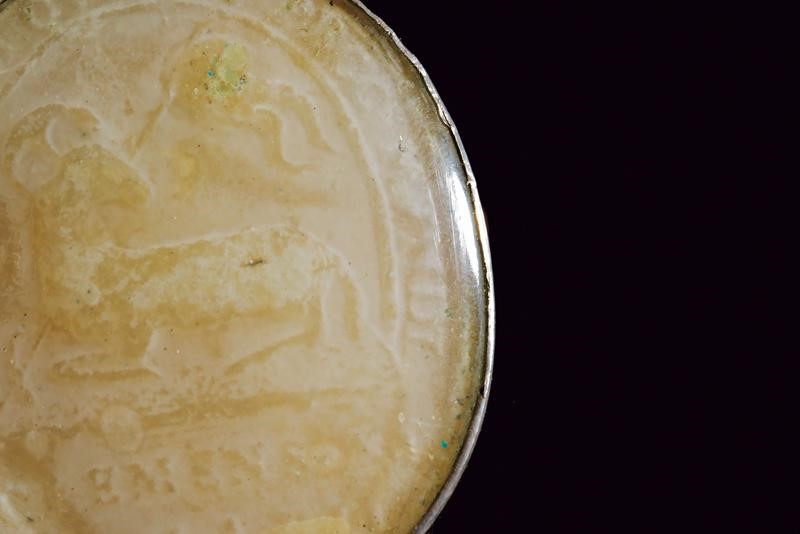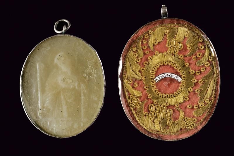 Both elliptical. One made of white wax (?) with metal frame and under glass. The other with colour miniature depicting a priest holding a crucifix. With threads stitching on red silk behind. In metal frame and under glass.