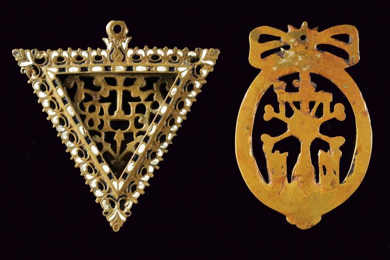 One made of brass, shaped as an inverted triangle, richly pierced and enameled in black and white, with the cross and the Christogram "IHS" at the centre; suspension ring. The other one made of pierced bronze and of elliptical shape, the centre featuring