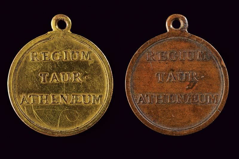 One made of bronze and one made of gilded bronze. On the obverse, ‘REGIUM TAUR ATHENÆUM’; on the reverse, laurel branches joined by a ribbon.