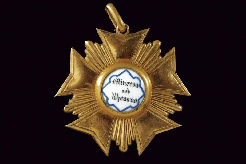Made of gilded metal with enamelled medallions, one medallion with the inscription "Minerva und Rhenana", on the other a knightly coat of arms. On a neck ring.