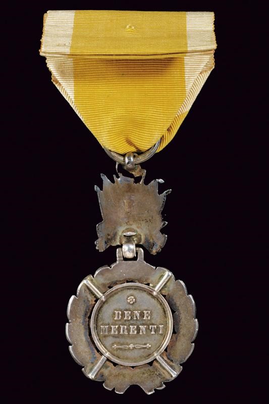 On the obverse bust (right) with the inscription "PIVS IX PON. MAX.". Opus "B. Zaccagnini". Surrounded by a green-enameled laurel wreath with red berries (missing parts, probably this medal was made when the honour was created). On the reverse, "BENE/MERE