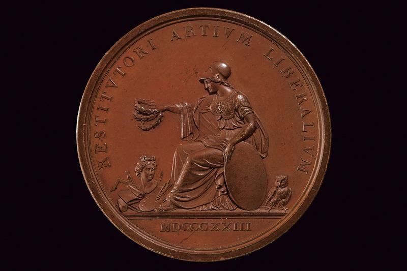 Issued in 1822 to commemorate the restoration of the Academy of Fine Arts. On the obverse, bust in uniform (left). Inscription "CAROLO FELICI REGI OPTIMO ACADEMIA INSTAVRATA". Opus: A. LAVY F. ET INV. On the reverse, Minerva with helmet seated towards the