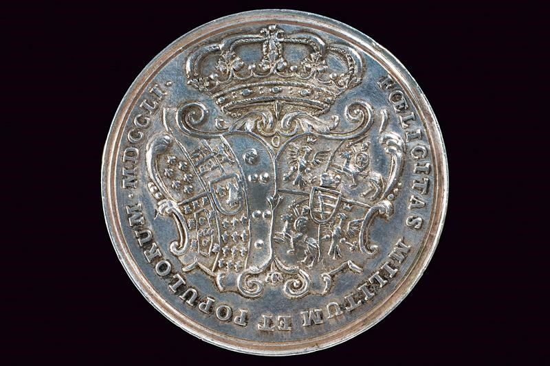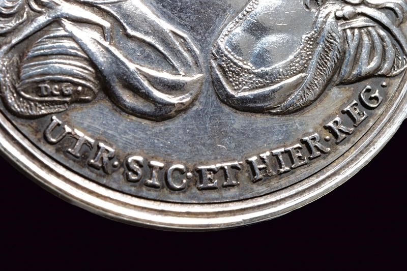 On the obverse, the busts of the king and queen facing each other. With the inscription "CAROLUS ET AMALIA UTR SIC ET HIER REG". Opus Gaetano De Gennaro. On the reverse, coats of arms of the two Houses surmounted by a royal crown and inscription "FOELICIT