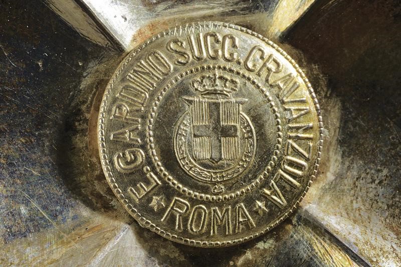 Grand officer's star with silver swords, the centre gilded and enameled. Vertical pin. With Gardino/Roma marking.