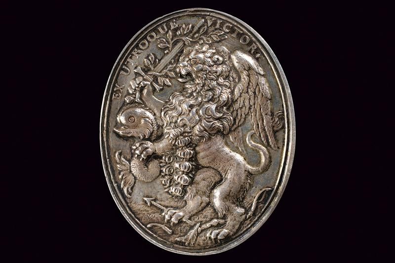 Replica of the famous medal struck at the Nuremberg mint in 1687, Opus Georg Hautsch. Silver, oval, on the obverse the scene of the Doge receiving the surrender and homage of the brothers Mustafà and Hassan Pascià, with the inscription "PARCERE SUBIECTIS