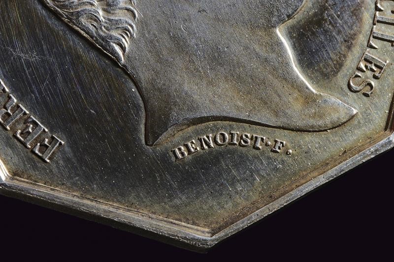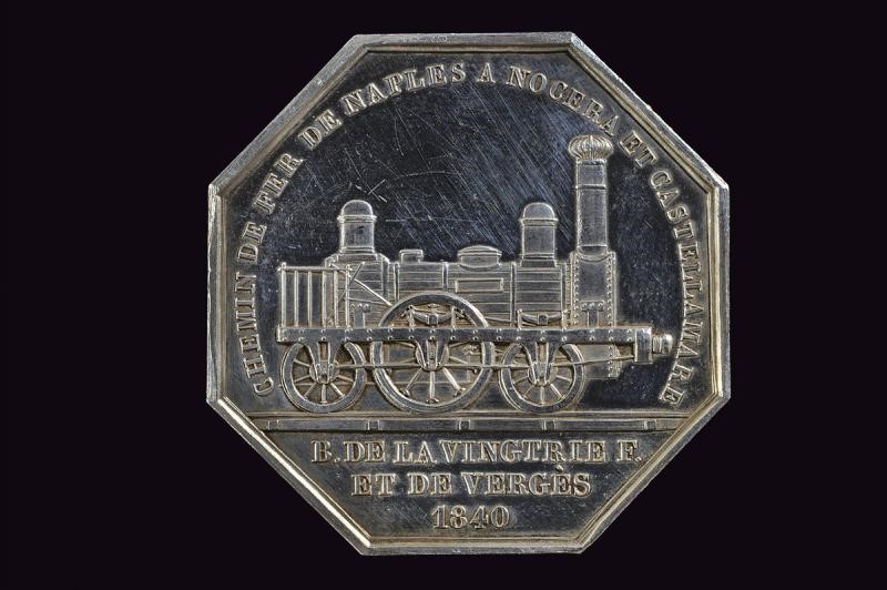For the inauguration of the Naples-Nocera-Castellamare railway. Of octagonal shape. On the obverse, bust (right) and inscription "FERDINAND II ROI DES DEUX SICILES". Opus Felix Benoist. On the reverse, image of a steam locomotive and inscription "CHEMIN D