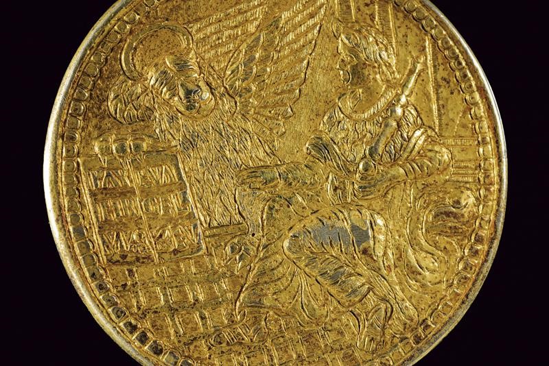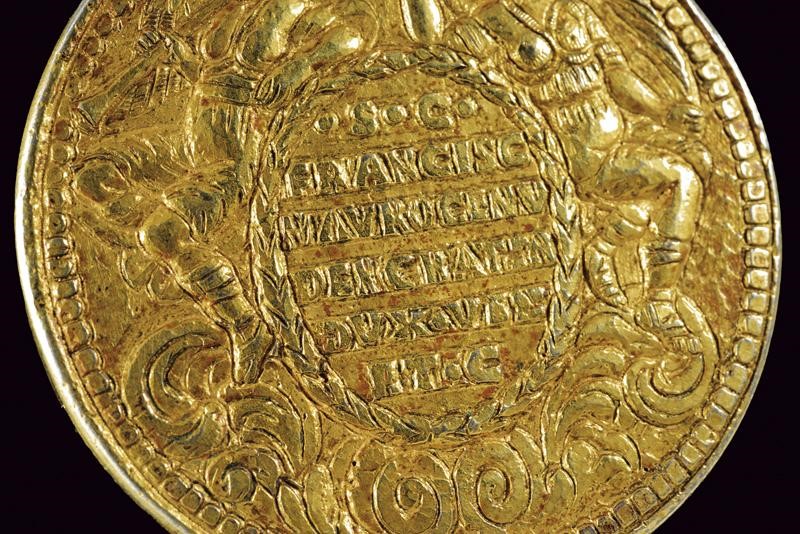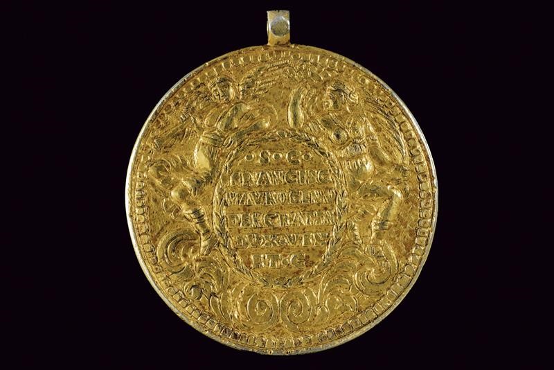 Of circular form in gilded bronze. On the obverse, the Doge Francesco Morosini sitting with sceptre and the lion of St. Mark. On the back inscription in the centre in an oval "S. C. FRANCISC MAUROCENO DEI CRA TEN DUX VEN ET C" (not entirely legible). On s