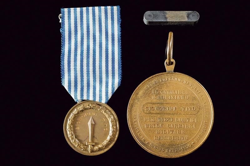 In bronze. On the obverse, St. Maurice mounted on a horse with the inscription "S. MAURIZIO PROTETTORE DELLE NOSTRE ARMI". Opus: Ferraris. On the reverse, inscription in the centre "AL CAVALIERE MAURIZIANO SIGNORINI TITO (in relief) PER DIECI LUSTRI NELLA
